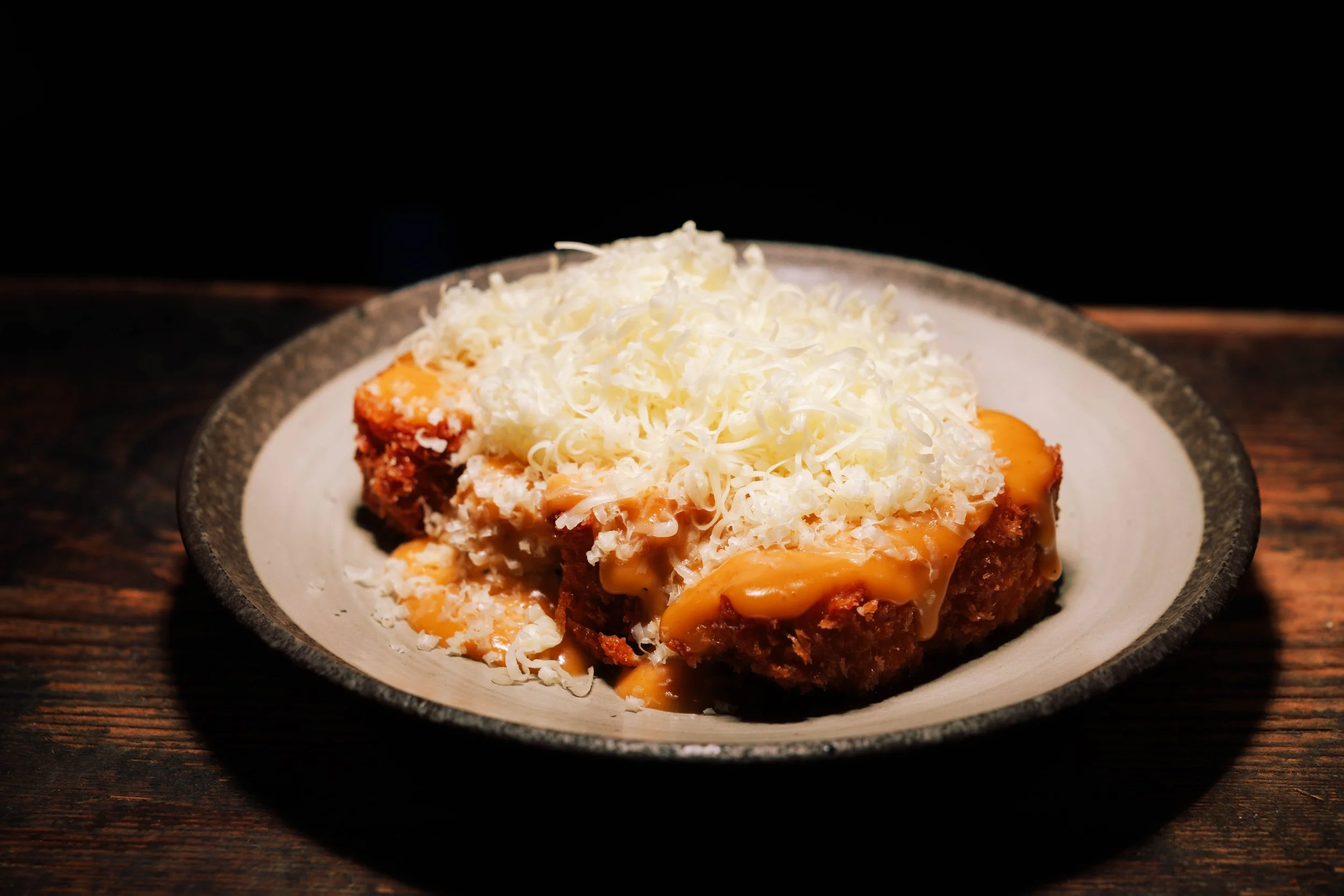 Crispy panko-crumbed chicken, cheese snow, sweet-savory cream sauce. Comfort on a plate.