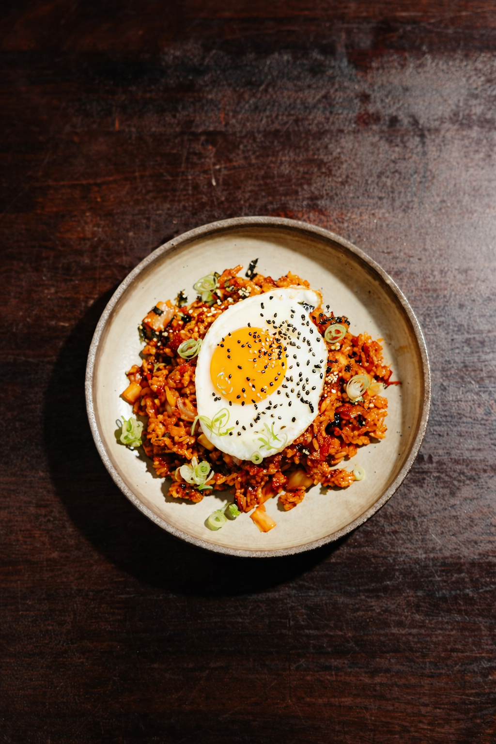 Stir-fried rice with bacon, kimchi, spring onion, fried egg. Smoky, spicy, a GAJA staple.
